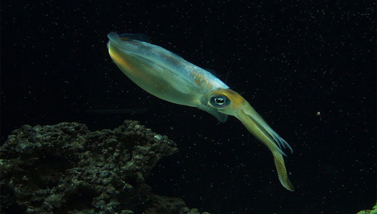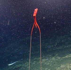Whiplash squids hover in a vertical, tuning-fork-like posture at depths nearing 5,000 feet. Their slender bodies use fin-based locomotion, and some species feature glowing photophores around their eyes and mantles. Rarely observed until the 1990s, their presence is now better documented thanks to advanced remote-operated vehicles.