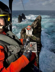 The lighthouse stands atop Stóridrangur, one of four sea stacks collectively known as Þrídrangar, meaning “three rock pillars”—though there are actually four: Stóridrangur, Þúfudrangur, Klofadrangur, and an unnamed fourth. The idea of constructing a lighthouse on these rugged cliffs was daring by any standard. With no helicopters available in 1939, the project demanded unimaginable physical effort. In 1938, a team of local Westman Islands mountaineers scaled the sheer rock face to build a rudimentary path to the summit. The story of how they reached the top is legendary: one man knelt on the rock, the next climbed on his back, and the third balanced atop both to grab hold of the upper edge of the cliff. It was teamwork on the edge of catastrophe. As Árni G. Þórarinsson, the project director at the time, recalled in an old interview, “I can’t even describe what I felt watching that moment. It was incredibly dangerous—but they did it.”