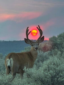 There are moments in nature so flawlessly timed that they feel like a gift. This was one of them. As the sun gently touched the horizon, its rays aligned with the antlers of a mule deer standing still in a sea of golden grass. The deer’s silhouette became a canvas for the sun’s final flourish—a scene of quiet magnificence, where animal and sky became one.