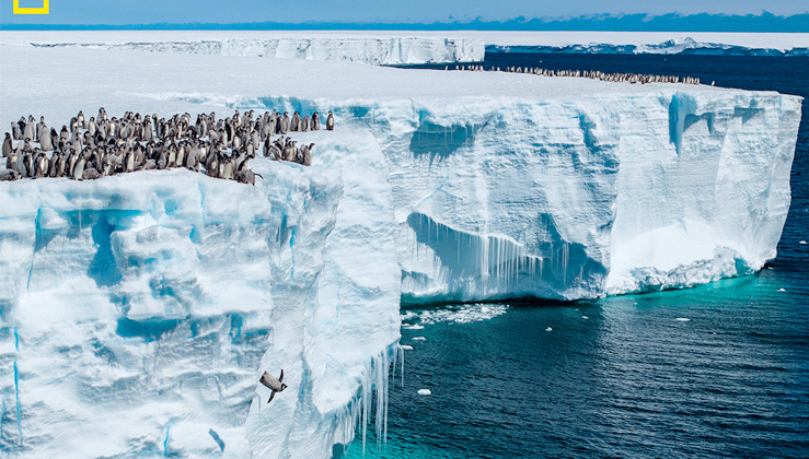 In a world-first, National Geographic captures rare footage of emperor penguin chicks leaping off a 50-foot ice cliff into the Southern Ocean for their very first swim.