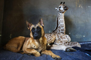 At a South African wildlife orphanage, a Belgian Malinois named Hunter has formed a touching bond with Jazz, a rescued baby giraffe, showing that friendship knows no species.