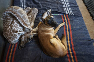 In a heartwarming tale from South Africa, an unexpected friendship has blossomed between a rescued baby giraffe and a loyal guard dog at a wildlife orphanage. A nine-day-old giraffe named Jazz was brought to The Rhino Orphanage in Limpopo Province after a concerned farmer discovered the fragile animal alone in the wild—dehydrated, weak, and without its mother. The farmer contacted the center for help, and the team rushed to bring the calf into their care. Upon Jazz’s arrival, the orphanage’s resident guardian, Hunter—a young Belgian Malinois—immediately took a protective liking to the lanky newcomer.