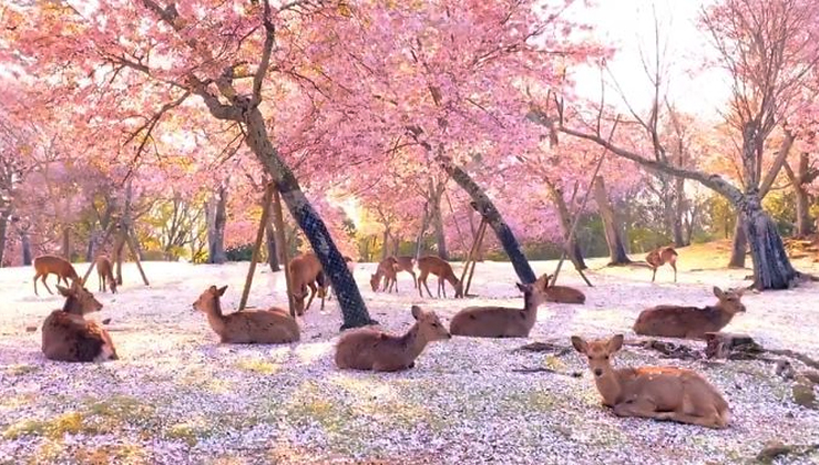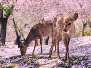 The footage Ikeda shared on social media showcases a calm, almost dreamlike atmosphere as the deer move among the falling petals, one even nibbling a cracker he had brought along. Nara Park, located in the historic city of Nara, is famous for its population of free-roaming Sika deer. These animals are so familiar with humans that they often approach visitors for a special treat—deer crackers sold throughout the park. However, when the COVID-19 pandemic emerged and tourists vanished, the deer began wandering beyond the park’s boundaries in search of food, roaming city streets and surprising locals.
