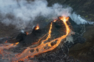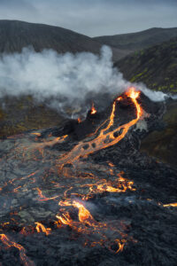 The new eruption started on March 19 and is located in Geldingadalur, a valley on the Reykjanes Peninsula, roughly 32 kilometers (20 miles) from Iceland’s capital, Reykjavík. Remarkably, this region hasn’t seen a volcanic eruption for over 800 years. Fortunately, this event poses little threat to nearby communities—it’s happening in a remote area, and the volcano is relatively calm in its behavior. This makes it safer to approach and ideal for capturing striking visual imagery.For several days now, I’ve been photographing this fiery spectacle both from above in a helicopter and with my drone.